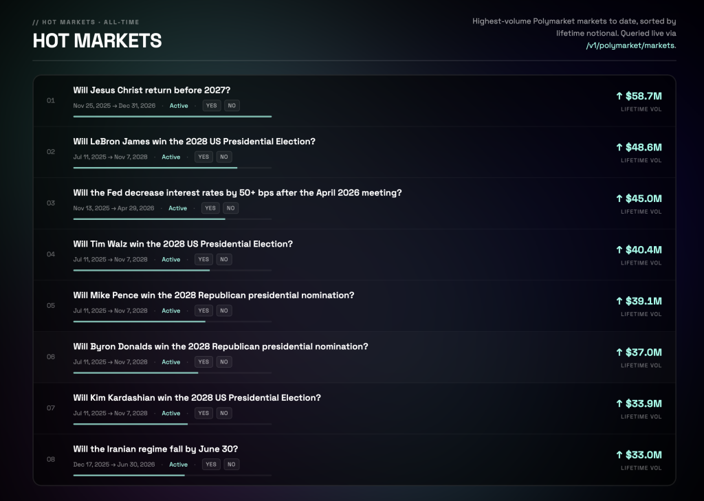Prediction markets don’t just reflect opinions–they reprice expectations. This is the kind of signal that’s now accessible via API.